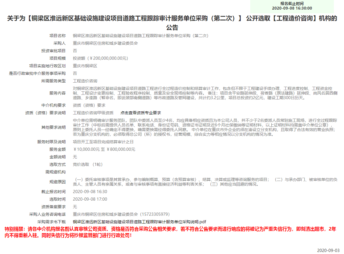 近日,重庆网上中介服务超市上的一个项目引起了建设第一媒体的关注,项目为“重庆铜梁区淮远新区基础设施建设项目道路工程跟踪审计服务单位采购 公开选取【工程造价咨询】机构”,采购人重庆市铜梁区住房和城乡建设委员会,项目总投资为2亿元,建设工期300日历天,服务金额0元至80万元,项目要求:中介单位需明确审计服务团队,团队中委派人员至少4名,均应具备相应资质且为本公司人员,并不少于2名委派人员常驻施工现场,进行全过程造价控制和结算审计工作,包含但不限于工程建设手续办理、工程进度控制、工程资金控制、工程设计变更控制、工程验收程序控制、质量及安全现场控制等内容。