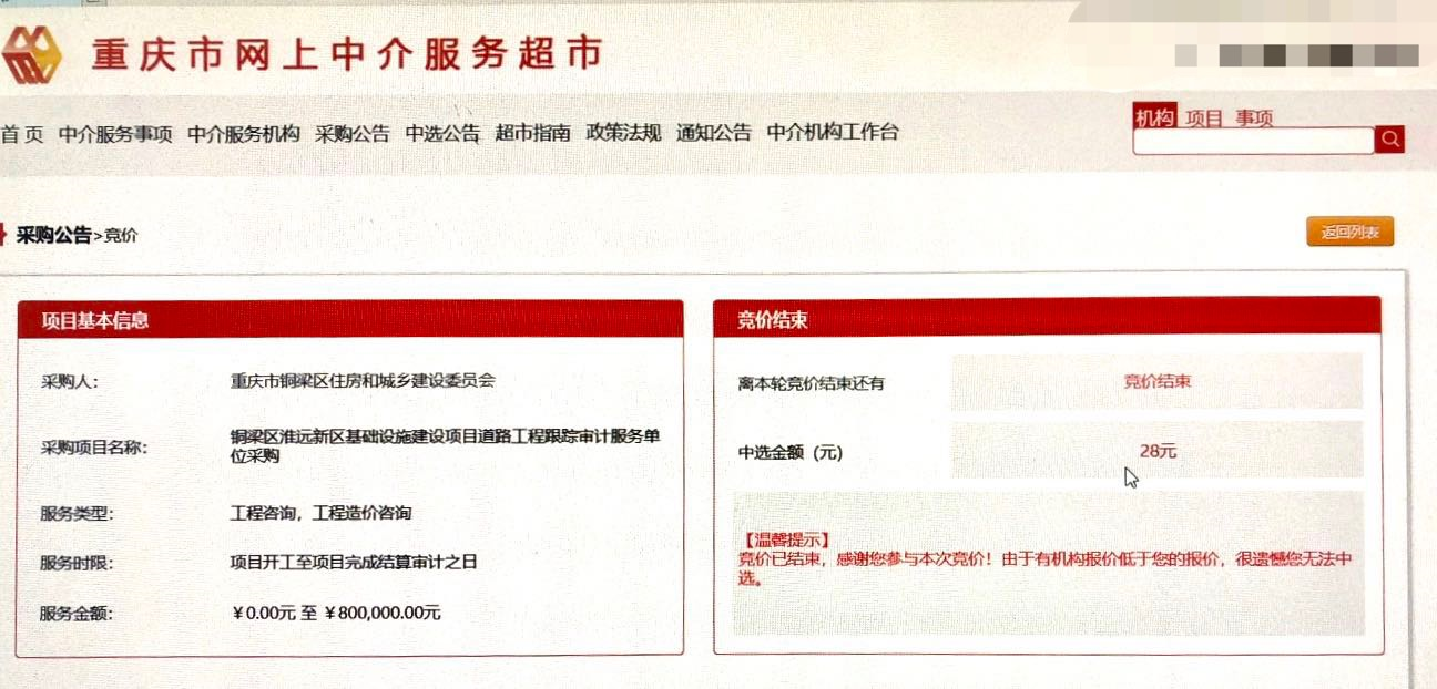 记者联系采购人重庆市铜梁区住房和城乡建设委员会后,甲方表示可能是系统出现错误,最终没有定这家28元报价的中标单位,重新进行了第二次采购,并且已经于今日发布新的采购公告。