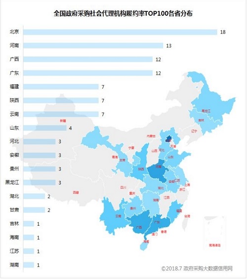 1、全国政府采购社会代理机构履约率TOP100榜单&各省分布