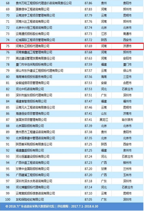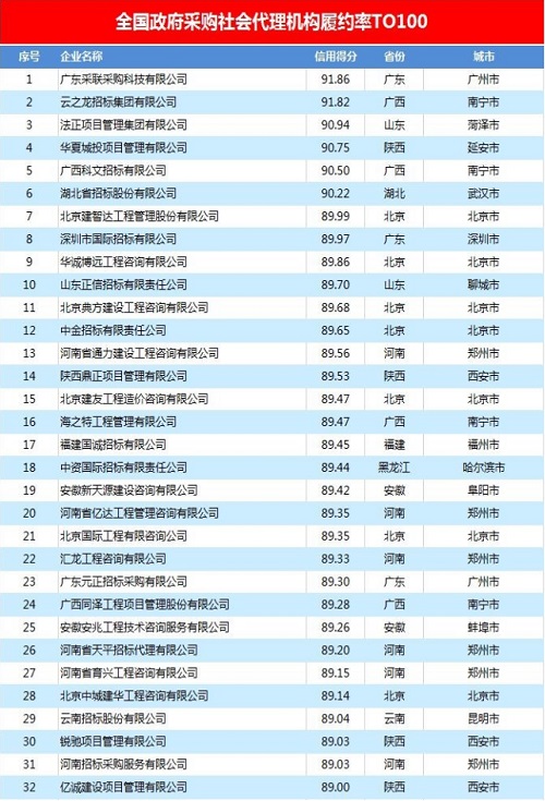 2017.07-2018.06全国政府采购企业履约率TOP100社会代理机构&TOP500供应商